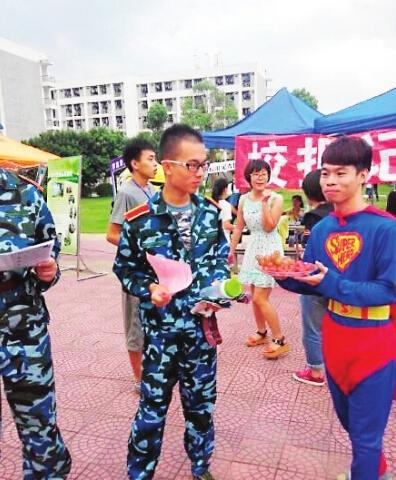 “超人”鲜艳的衣服加上五个男生的热情,小小免费水果摊很快就红了起来。很多军训新生到了休息时都会到水果摊前吃些水果。