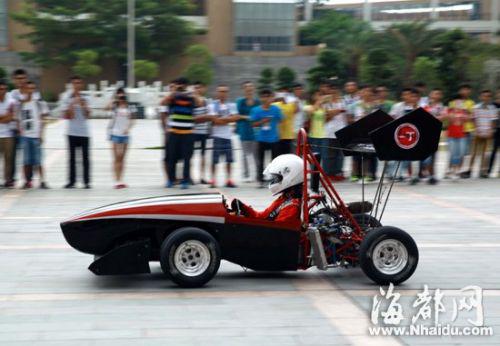 闽南网9月27日讯 大学生自己设计、制造方程式赛车,在福州大学城已经成了潮流。25日下午,福州大学和福建工程学院,不约而同地举行新车发布会,赛车手全副武装,驾驶赛车进行场外试跑。这两支车队,都将参加于10月中旬在襄阳举行的中国大学生方程式汽车大赛。