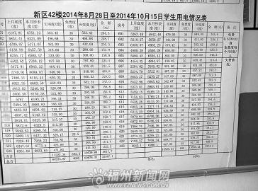 记者近日前往福州大学,在42号学生公寓楼前,张贴着该楼8月28日至10月15日的用电情况表。记者看到,根据用电情况表的显示,每人每月有5度的免费用电额度,超出部分按照每度0.533元计算。记者数后发现,用电超过500度的宿舍有45间,其中用电量最高的一间宿舍在48天里用电竟然高达948.96度。记者询问了几间用电超过700度的宿舍,同学们也表示不知道为什么用电突然会这么多。“上学期期末我们都在宿舍,一个月开着空调电费才160多元,这学期没开空调,而且国庆假期七天宿舍都没人,怎么会用掉这么多电?”一些同学表示不理解。