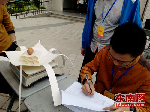 据悉,此次大赛从早上8点持续到中午12点,共有66个小组,共计200余人参赛。根据比赛规则,参赛选手必须在规定的80分钟内,利用由主办方提供的制图纸、透明胶和鸡蛋进行现场制作鸡蛋缓冲模型,要求作品的长宽高控制在30×30×30cm的范围之内,保证作品能通过20×20cm的框格。作品完成后在不破坏的情况下能使评委、观众直接看到鸡蛋的,方为有效作品,即不允许缓冲设施完全包裹鸡蛋。完成模型后,参赛队伍须派出一名代表从15米的高空对准地面上的圆心将作品抛下。
