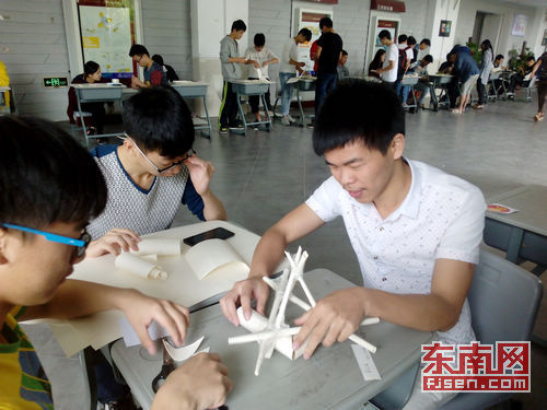 选手们正在制作鸡蛋缓冲模型。林雪美摄