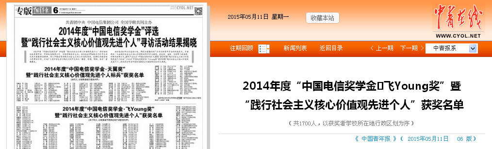 《 中国青年报 》2015.5.11:2014年度“中国电信奖学金•飞Young奖”暨“践行社会主义核心价值观先进个人”获奖名单