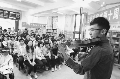 近日,福州市建新镇台屿农家书屋迎来10周岁生日,书屋负责人陈松年等6位老人专门邀来长期合作的福建工程学院师生和小读者们联欢。图为大学生在表演。 本报记者 关建东 摄