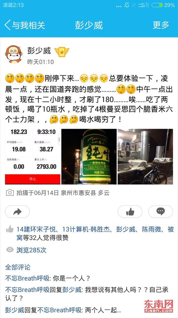 6月13日13时,他们从福州大学城出发,沿324国道一路骑行,途径福州,莆田,最后到达泉州丰泽区,而后返程。彭少威说,这次骑行他期盼了很久。刚好网上一个骑行网站发起了一个集“赞”骑行的活动,一个赞5公里。“我当时觉得想挑战一下,就在空间发了这样一个集赞活动,没想到会集到100个赞,原本承诺的500公里,现在虽然只是完成了一半,不过对我自己而言已经是一个突破。”