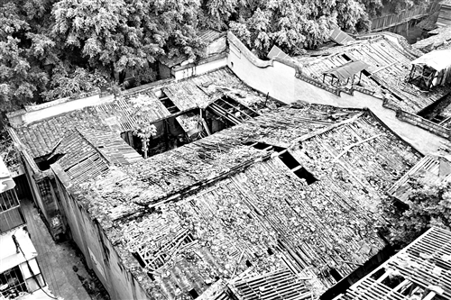 昨日,记者来到江滨西大道130号,古厝大门已闭,有保安在门前值守。从附近高楼可见,古厝屋顶已被掀开,但仍有两进结构被保留了下来。