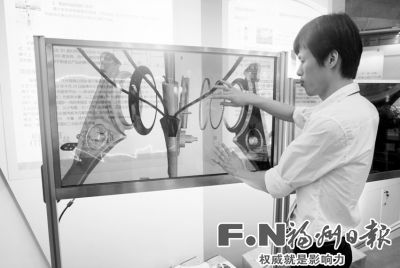 一套透明的显示设备上,观众只需通过手指简单触控操作,就能够全方位看到汽车、自行车等物品的外观以及产品内部构造。在8号展区,福建省纳金网信息技术有限公司现场展示的透明屏智能控制产品展示系统让人耳目一新,吸引不少人当场体验。“这套系统主要利用3D技术和触摸式透明屏相结合的方式,将3D虚拟物品及3D特效叠加到制造业产品展示上。”工作人员告诉记者,系统能实现物品360度旋转、拆分、缩放等体验互动功能,主要应用于制造业产品的展示和销售端。