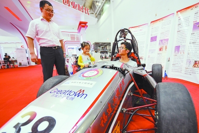 福建工程学院学生团队在展示自行研发的方程式赛车产品。
