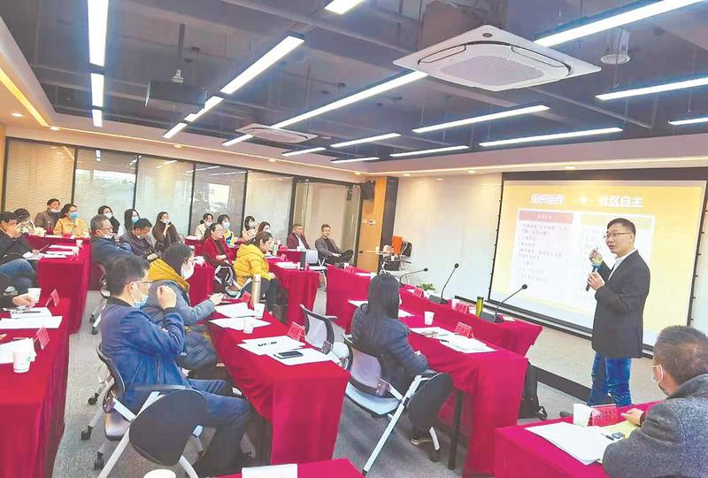 台湾专家唐国泰(右二)在两岸社区交流中心为社区干部和社工授课。本报记者 潘园园 摄