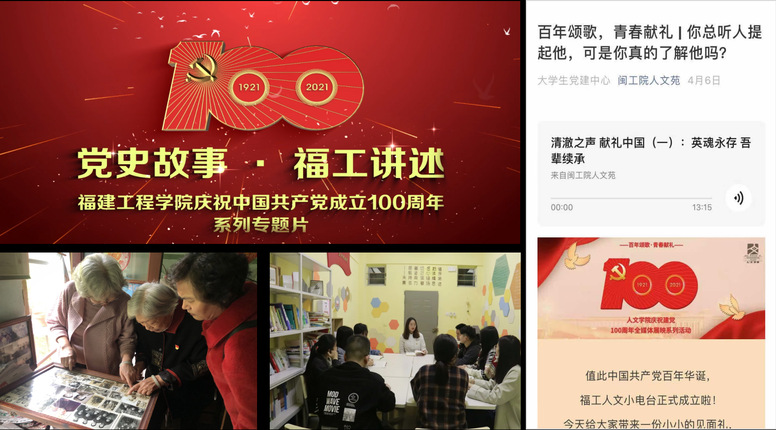 学校各单位积极拓展宣讲方式,通过访谈、制作音频、视频作品、举办故事会等多种方式方法,推动党史学习教育宣讲走进基层、深入师生。今年3月以来,学校开展“新青年对话老党员——福工学子聆听‘光荣在党50年’党员初心故事”主题活动,组织学生党员专访党龄超过五十年的学校退休老党员,聆听他们的初心故事并制作了专题片《光荣在党五十年》,以特别方式向党龄50年以上的老党员同志表达致敬。人文学院开展人文小电台广播剧展播活动,发挥学科优势和专业特长,在微信、微博、抖音等新媒体平台推出自制系列红色广播剧《清澈之声 献礼中国》。互联网经贸学院鳝溪之声广播电台则推出“青寻百年党史系列专题节目”,互联网经贸学院教工行政党支部和学生第二党支部还巧用“方寸邮票”做载体,开展“红色邮票学党史,方寸之中忆辉煌”主题宣讲活动。材料学院火种党支部开展“讲好党的故事,传承红色基因”主题故事会,分享红色党史微故事。交通学院依托“溪源书院”思政教育第二课堂,组织开展“党建进公寓”系列主题活动,邀请博士教授走进书院分享红色故事、启动“红色朗读者”党史诵读会、举办“灯塔行动”走进溪源书院等专题宣讲活动。