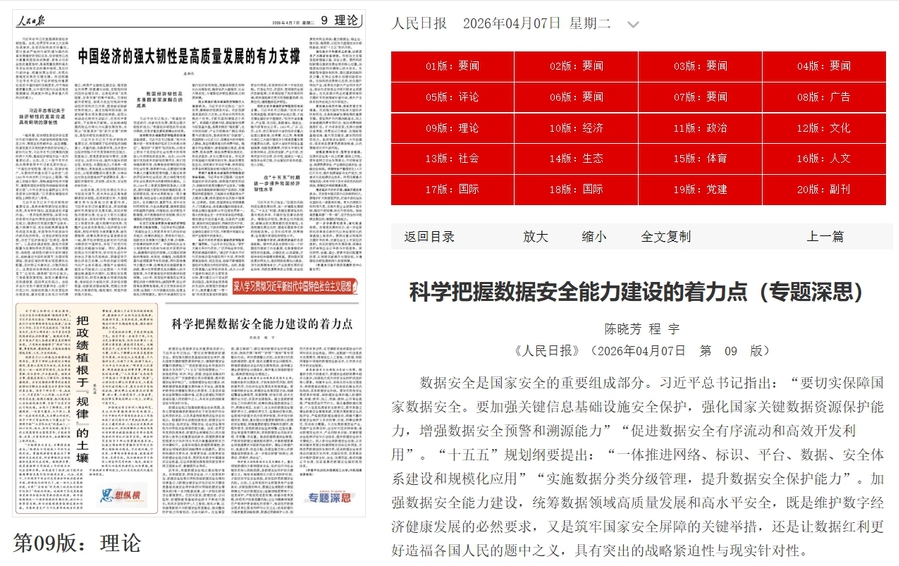4月7日,《人民日报》理论版(第09版)刊发我校互联网经贸学院陈晓芳博士为第一作者的理论文章《科学把握数据安全能力建设的着力点》,这是我校教师科研成果首次在“三报一刊”的理论版上发表。